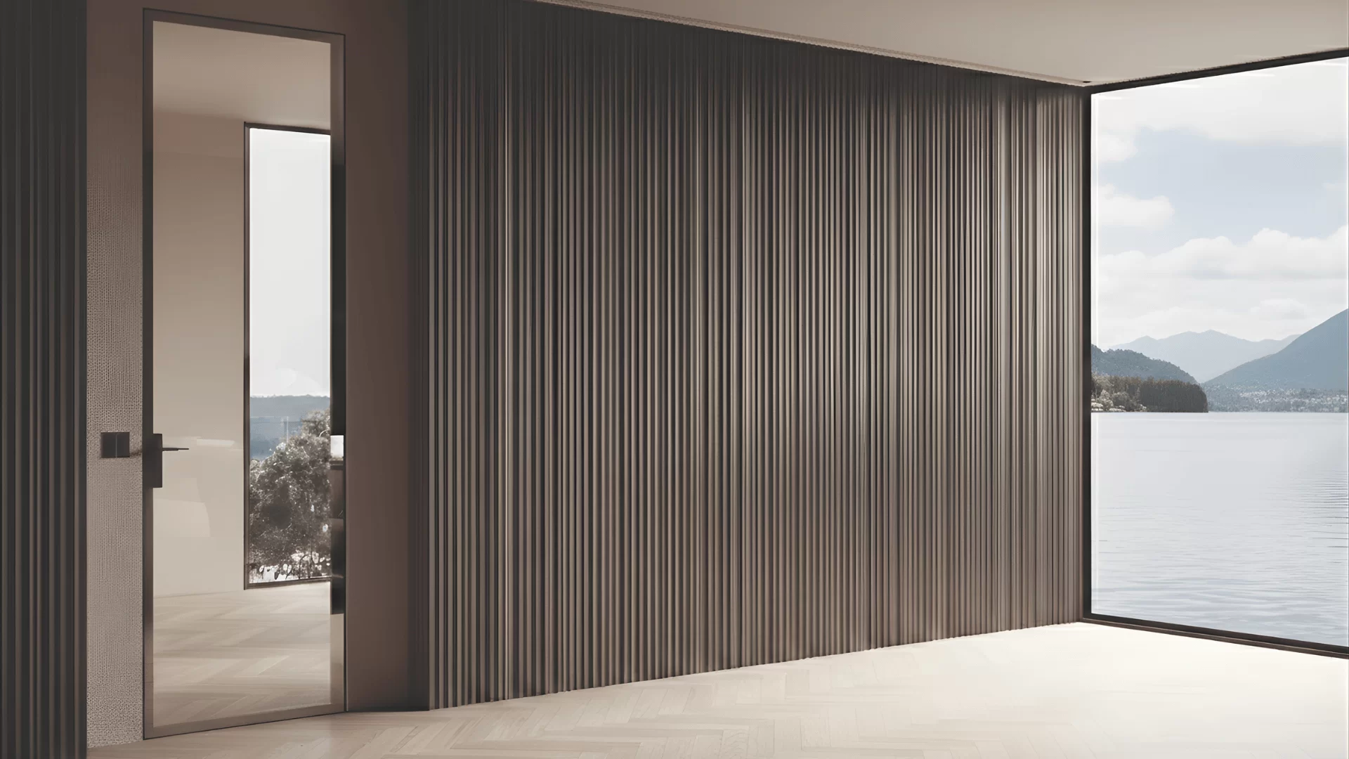 Una boiserie dal forte impatto estetico, dove i solchi che si intersecano modulano la superficie piana, creando un effetto chiaroscuro e affascinanti giochi di luce. Come una scultura con dettagli di forte caratterizzazione estetica e formale. Una superficie unica ed omogenea in cui l’elemento porta a battenti, eventualmente inserito come optional, risulta praticamente invisibile.