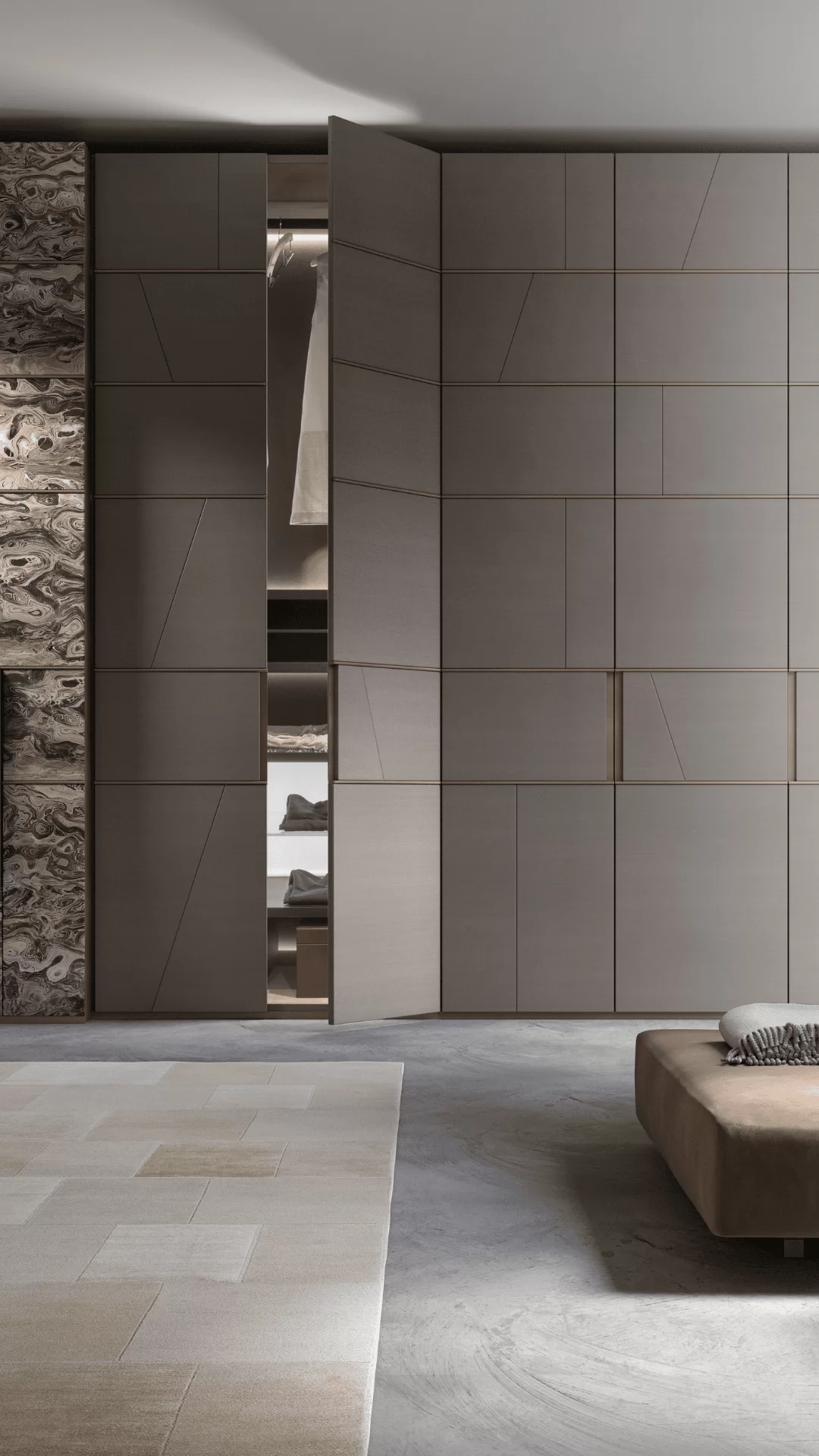 Sistema armadio su misura con pattern geometrico e moduli separati da profili in legno a sezione arrotondata, personalizzabile in dimensioni e finiture. Un design essenziale ma al tempo stesso elegantemente decorativo. Corredata da accessori, attrezzature e finiture interne personalizzabili, e con illuminazione LED integrata. È disponibile in combinazione con boiserie e porte integrate.
